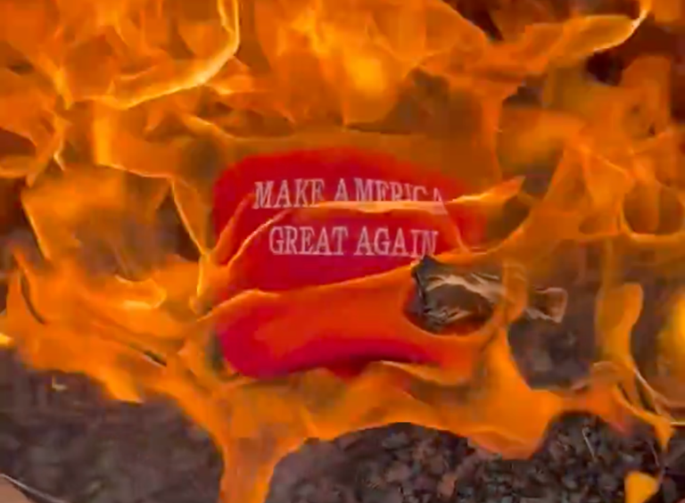 One of several videos showing red “MAGA” caps being burned. Twitter/X: @grimcalls